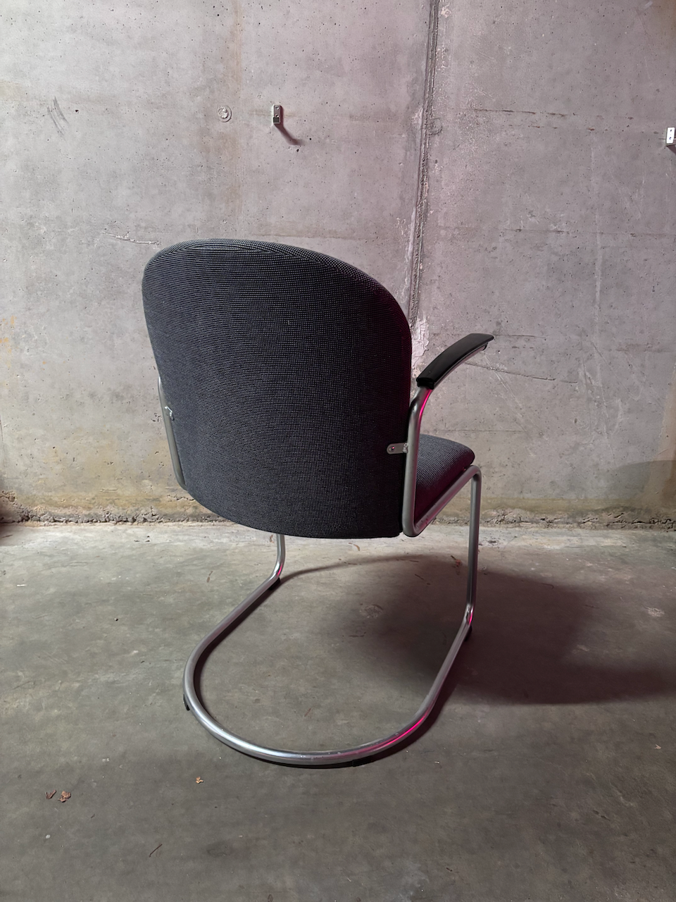 Mid century Gispen 413 armstoel ontworpen door Willem Hendrik Gispen voor Gispen in 1937 heeft een comfortabele zit en zwarte bakeliet armsteunen.